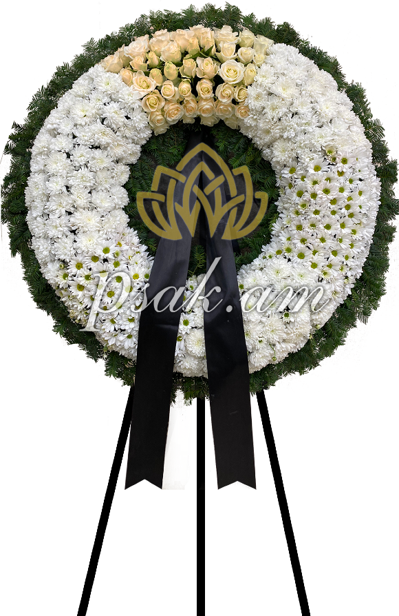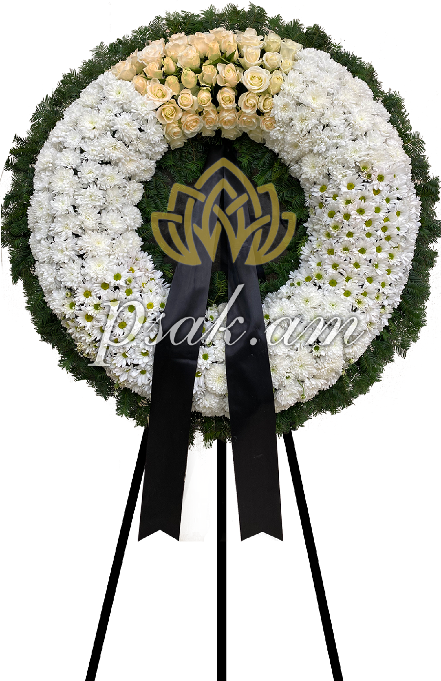 Պարզ Շրջանաձև Ծաղկեպսակ, որը պարտաստելիս օգտագործվում է 110 Զեմբելա տեսկի քրիզանտեմա, 6 կապ Ճապոնական երիցուկատիպ քրիզանտեմա և 40 հատ կրեմագույն վարդ։